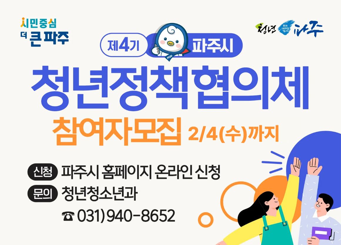 「파주시 청년 기본 조례」에 따라 파주시 청년들의 능동적인 사회참여 기회를 보장하고 소통을 통한 시민 중심의 청년정책 추진을 위해 「제4기 파주시 청년정책협의체」 구성원을 모집하오니 관심 있는 청년들의 많은 참여를 바랍니다.